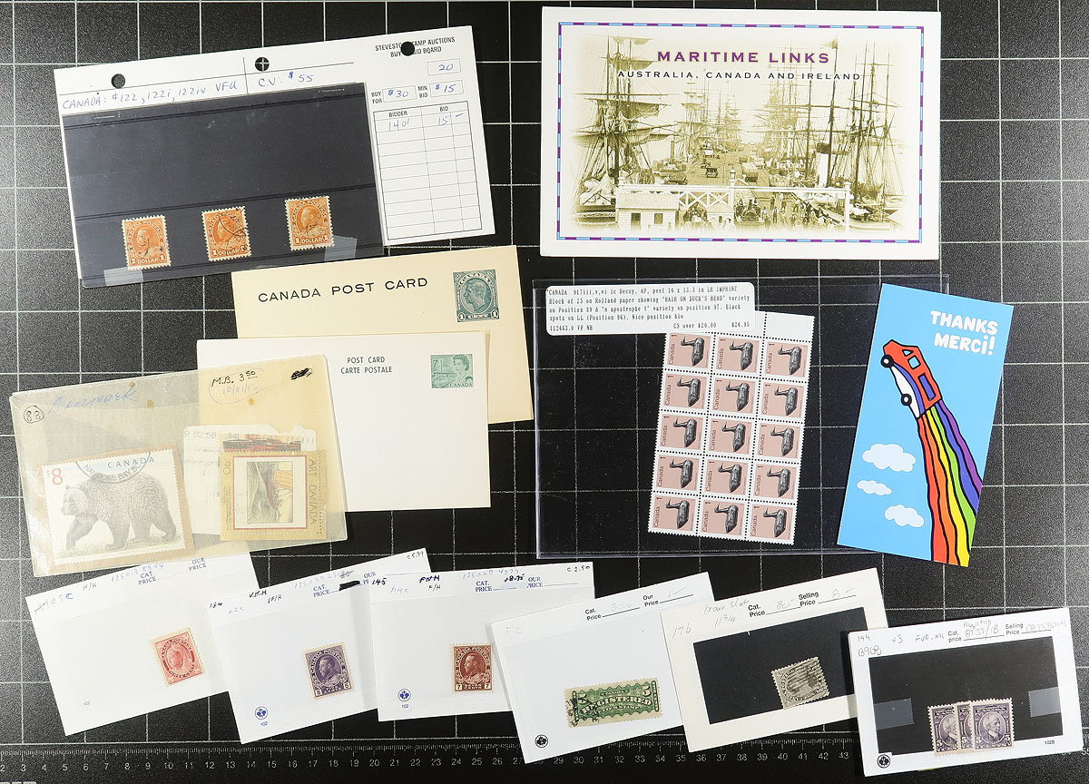 Box of Canadian "Catch All" #3. The third and final of three offerings in this sale, sure to please the philatelic sorter. Containing a wide-array of material, we did note mint and used including Officials, Plate Blocks, early Canada, and 5x the $5.00 Fabric Flag (mint), plus more! Many still on the original auction/bidboard cards from when originally purchased. Estimate =