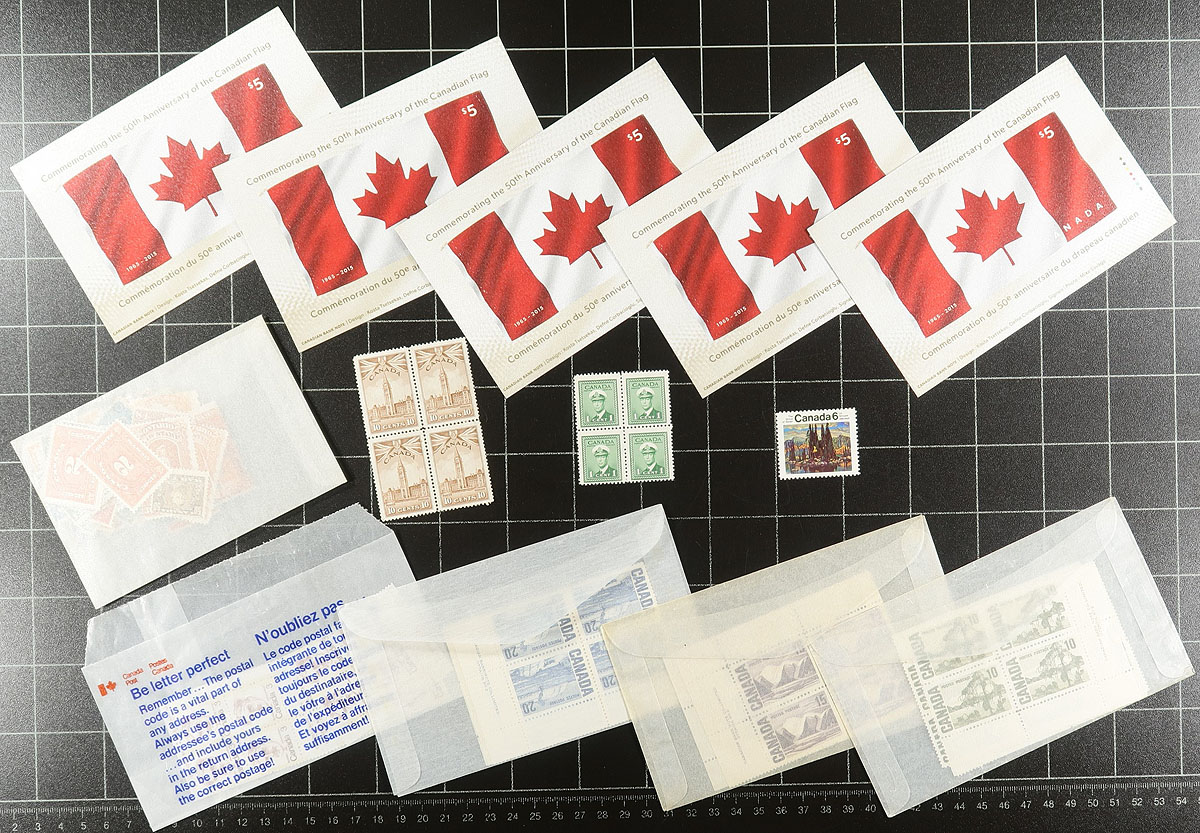Box of Canadian "Catch All" #3. The third and final of three offerings in this sale, sure to please the philatelic sorter. Containing a wide-array of material, we did note mint and used including Officials, Plate Blocks, early Canada, and 5x the $5.00 Fabric Flag (mint), plus more! Many still on the original auction/bidboard cards from when originally purchased. Estimate =