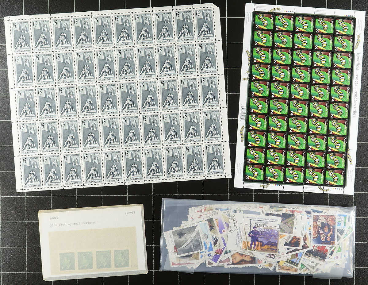 Box of Canadian "Catch All" #3. The third and final of three offerings in this sale, sure to please the philatelic sorter. Containing a wide-array of material, we did note mint and used including Officials, Plate Blocks, early Canada, and 5x the $5.00 Fabric Flag (mint), plus more! Many still on the original auction/bidboard cards from when originally purchased. Estimate =