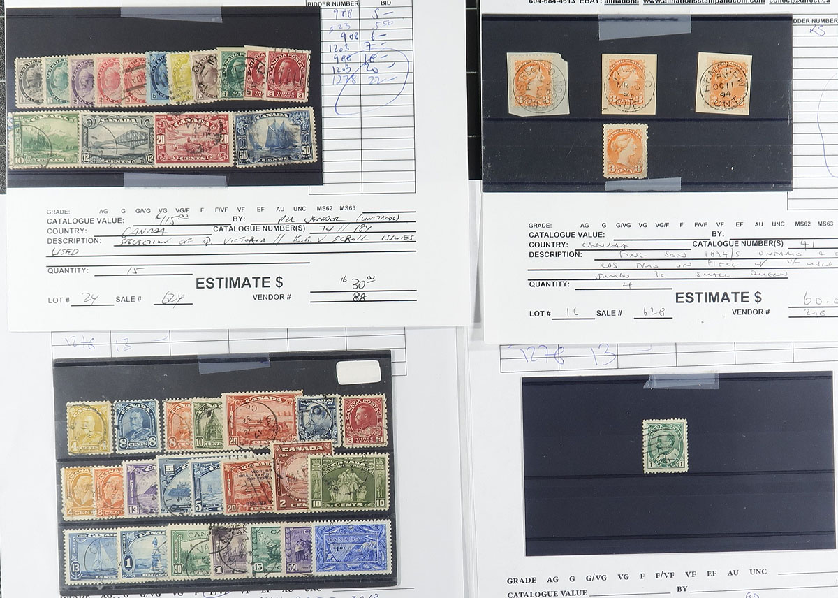 Box of Canadian "Catch All" #3. The third and final of three offerings in this sale, sure to please the philatelic sorter. Containing a wide-array of material, we did note mint and used including Officials, Plate Blocks, early Canada, and 5x the $5.00 Fabric Flag (mint), plus more! Many still on the original auction/bidboard cards from when originally purchased. Estimate =