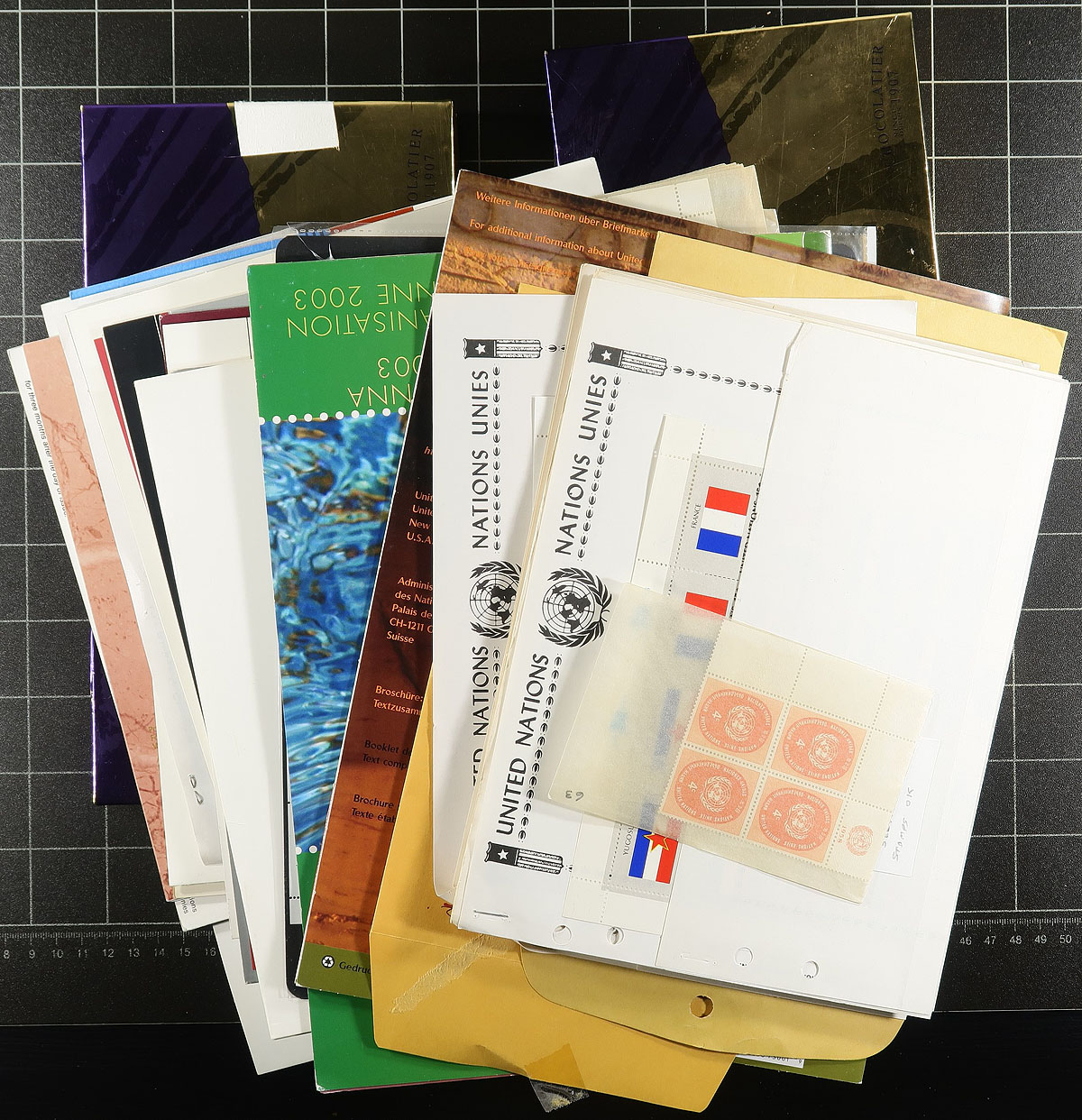 Accumulation of never hinged United Nations material, 1960's-1990's, containing many hundreds of stamps in a few formats including in glassines, stock pages, presentation packs, loose in a few boxes, and more. The collection appears to have representation from all three offices, noting singles, sets, blocks, and souvenir sheets including better issues such as Endangered Species, Flags sheetlets, Survival of the Forests, and more. Owner's 2012 Scott catalogue value for just a portion of the lot totals US$477.00, leaving potential value for collectors and dealers. A nice lot noting several suitable topical and thematic subjects, overall fine to very fine. Estimate =
