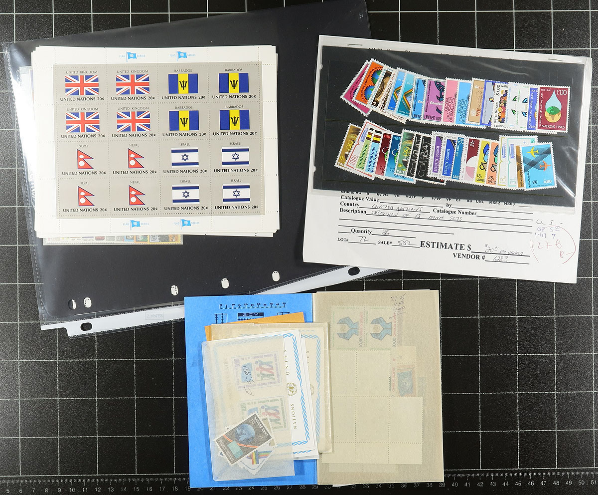 Accumulation of never hinged United Nations material, 1960's-1990's, containing many hundreds of stamps in a few formats including in glassines, stock pages, presentation packs, loose in a few boxes, and more. The collection appears to have representation from all three offices, noting singles, sets, blocks, and souvenir sheets including better issues such as Endangered Species, Flags sheetlets, Survival of the Forests, and more. Owner's 2012 Scott catalogue value for just a portion of the lot totals US$477.00, leaving potential value for collectors and dealers. A nice lot noting several suitable topical and thematic subjects, overall fine to very fine. Estimate =