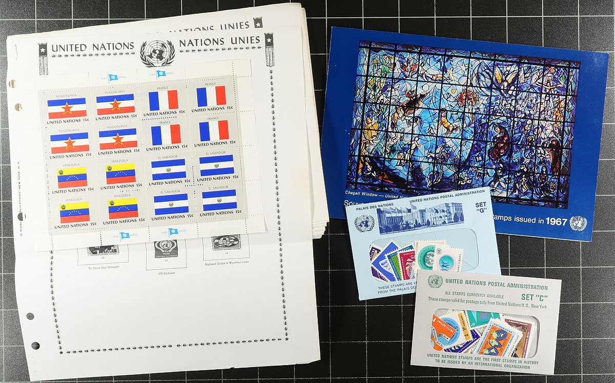 Accumulation of never hinged United Nations material, 1960's-1990's, containing many hundreds of stamps in a few formats including in glassines, stock pages, presentation packs, loose in a few boxes, and more. The collection appears to have representation from all three offices, noting singles, sets, blocks, and souvenir sheets including better issues such as Endangered Species, Flags sheetlets, Survival of the Forests, and more. Owner's 2012 Scott catalogue value for just a portion of the lot totals US$477.00, leaving potential value for collectors and dealers. A nice lot noting several suitable topical and thematic subjects, overall fine to very fine. Estimate =