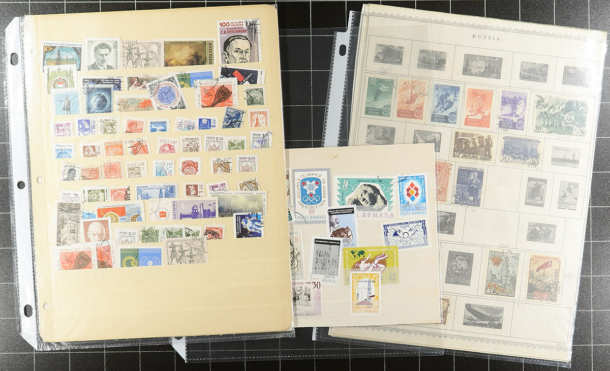 Accumulation of mint and used Russia, containing a few thousand stamps in a variety of formats including several album pages, glassines, stock pages, etc. A quick cursory check indicated mint and or used singles, sets, a few souvenir sheets, and more, noting a few sets cataloguing $10 and up, with the majority of material generally ranging from the 1920's to the 1990's. Owner's 2016 Scott catalogue value for only a portion of the lot totals $421.00, leaving potential value for collectors and dealers to organize. A nice lot for the worldwide collector. Estimate =