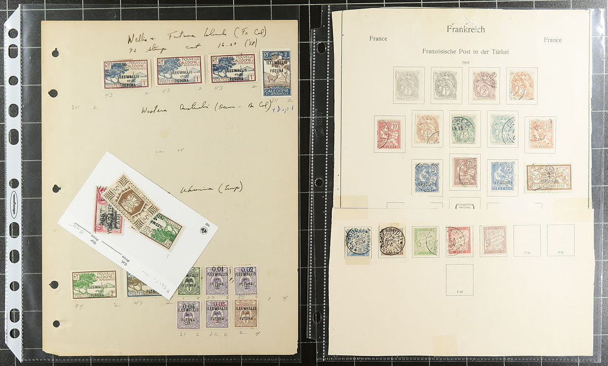 Accumulation of mostly used France and French Colonies, 1880's-1970's, containing probably over 1,000 stamps in album or stock pages, and several glassines. A cursory check indicated a fairly even split of France and Colony material, decently organized on pages, noting singles, a few sets, and back of the book material, including sets of "Defence of the Empire" Vichy common design semi-postals (low-values), along with classic definitives, semi-postals, and more. A spot check indicated some stamps cataloguing $10 and up, with the owner's Scott 2014 catalogue value for the lot totaling $1,264.00. Some faults noted with the early material, still a nice starter lot to this classic area of philately. Estimate =