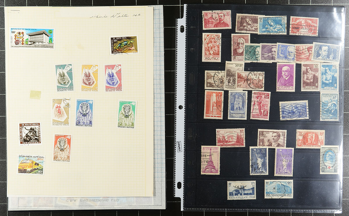 Accumulation of mostly used France and French Colonies, 1880's-1970's, containing probably over 1,000 stamps in album or stock pages, and several glassines. A cursory check indicated a fairly even split of France and Colony material, decently organized on pages, noting singles, a few sets, and back of the book material, including sets of "Defence of the Empire" Vichy common design semi-postals (low-values), along with classic definitives, semi-postals, and more. A spot check indicated some stamps cataloguing $10 and up, with the owner's Scott 2014 catalogue value for the lot totaling $1,264.00. Some faults noted with the early material, still a nice starter lot to this classic area of philately. Estimate =