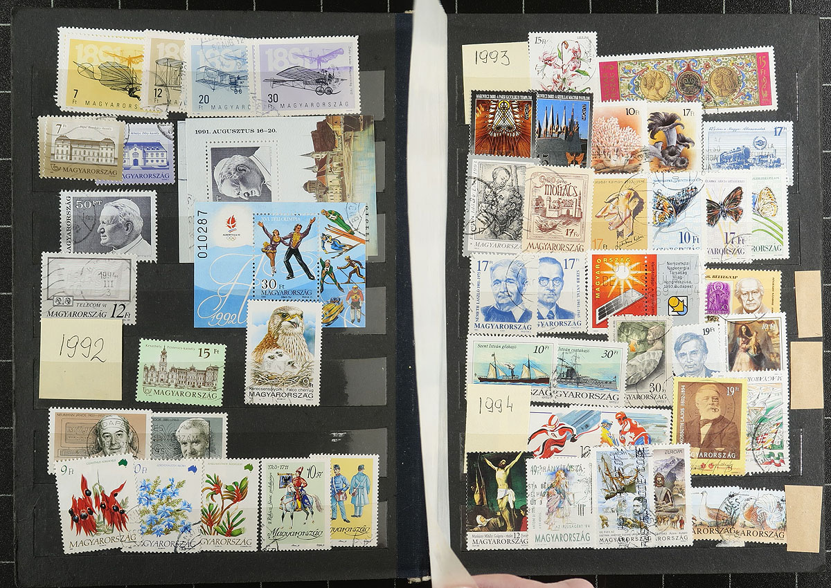 Large accumulation of mint and used Hungary, 1870's-2000's, containing several thousands of stamps in over 100 stock or album pages, and a few stockbooks. A cursory check indicated material ranging from Scott #4/3200, including singles, sets, souvenir sheets, back of the book issues, and a stockbook of used occupation stamps. We note some material cataloguing $5 to $10 each, with the owner's 2012 Scott catalogue value for the majority of material totaling $830.00, leaving better finds for the dedicated collector. A good lot for the worldwide collector, overall fine to very fine. Estimate =