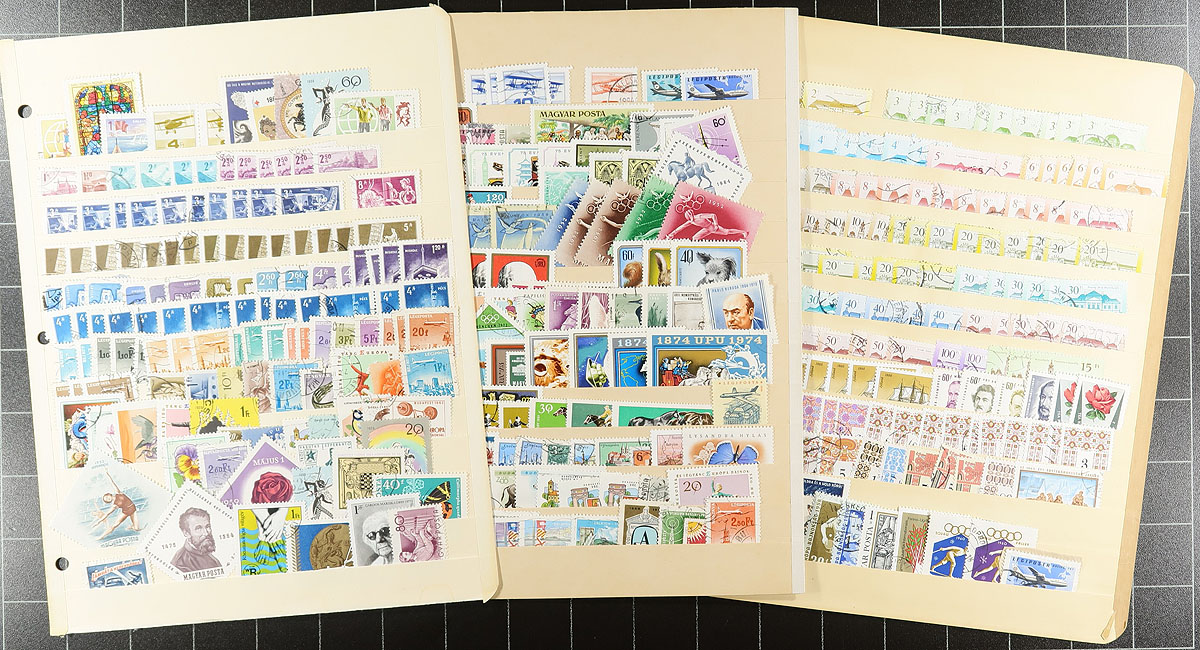 Large accumulation of mint and used Hungary, 1870's-2000's, containing several thousands of stamps in over 100 stock or album pages, and a few stockbooks. A cursory check indicated material ranging from Scott #4/3200, including singles, sets, souvenir sheets, back of the book issues, and a stockbook of used occupation stamps. We note some material cataloguing $5 to $10 each, with the owner's 2012 Scott catalogue value for the majority of material totaling $830.00, leaving better finds for the dedicated collector. A good lot for the worldwide collector, overall fine to very fine. Estimate =