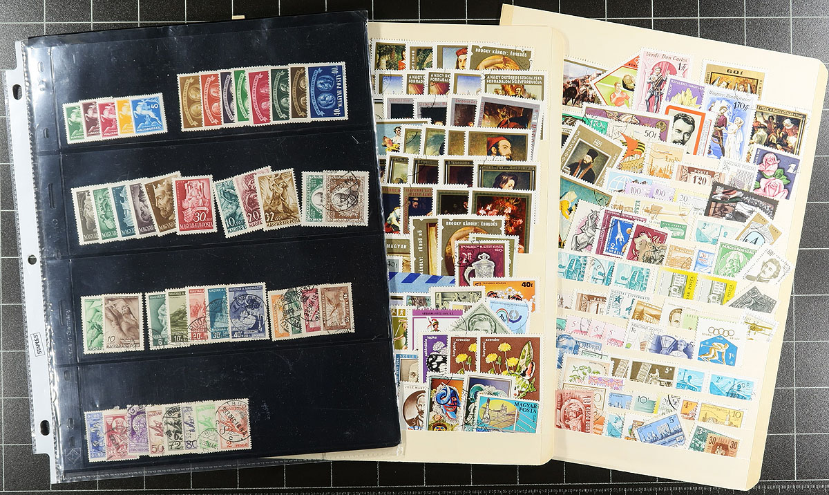 Large accumulation of mint and used Hungary, 1870's-2000's, containing several thousands of stamps in over 100 stock or album pages, and a few stockbooks. A cursory check indicated material ranging from Scott #4/3200, including singles, sets, souvenir sheets, back of the book issues, and a stockbook of used occupation stamps. We note some material cataloguing $5 to $10 each, with the owner's 2012 Scott catalogue value for the majority of material totaling $830.00, leaving better finds for the dedicated collector. A good lot for the worldwide collector, overall fine to very fine. Estimate =