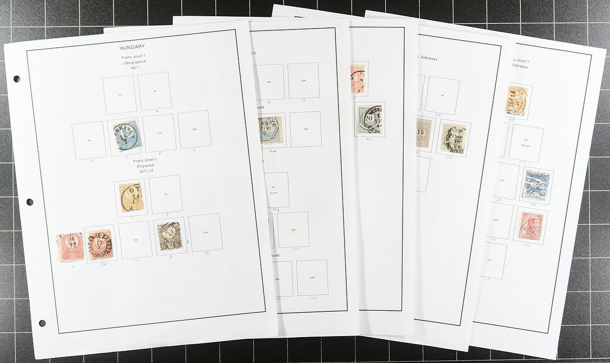 Large accumulation of mint and used Hungary, 1870's-2000's, containing several thousands of stamps in over 100 stock or album pages, and a few stockbooks. A cursory check indicated material ranging from Scott #4/3200, including singles, sets, souvenir sheets, back of the book issues, and a stockbook of used occupation stamps. We note some material cataloguing $5 to $10 each, with the owner's 2012 Scott catalogue value for the majority of material totaling $830.00, leaving better finds for the dedicated collector. A good lot for the worldwide collector, overall fine to very fine. Estimate =