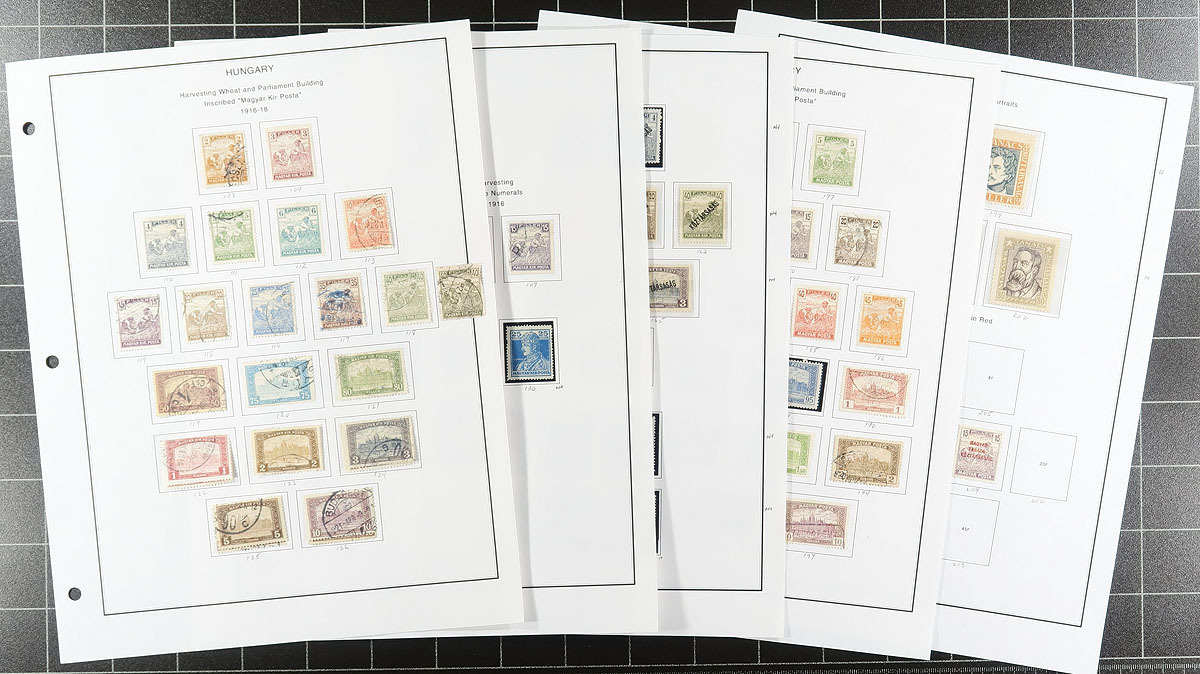 Large accumulation of mint and used Hungary, 1870's-2000's, containing several thousands of stamps in over 100 stock or album pages, and a few stockbooks. A cursory check indicated material ranging from Scott #4/3200, including singles, sets, souvenir sheets, back of the book issues, and a stockbook of used occupation stamps. We note some material cataloguing $5 to $10 each, with the owner's 2012 Scott catalogue value for the majority of material totaling $830.00, leaving better finds for the dedicated collector. A good lot for the worldwide collector, overall fine to very fine. Estimate =