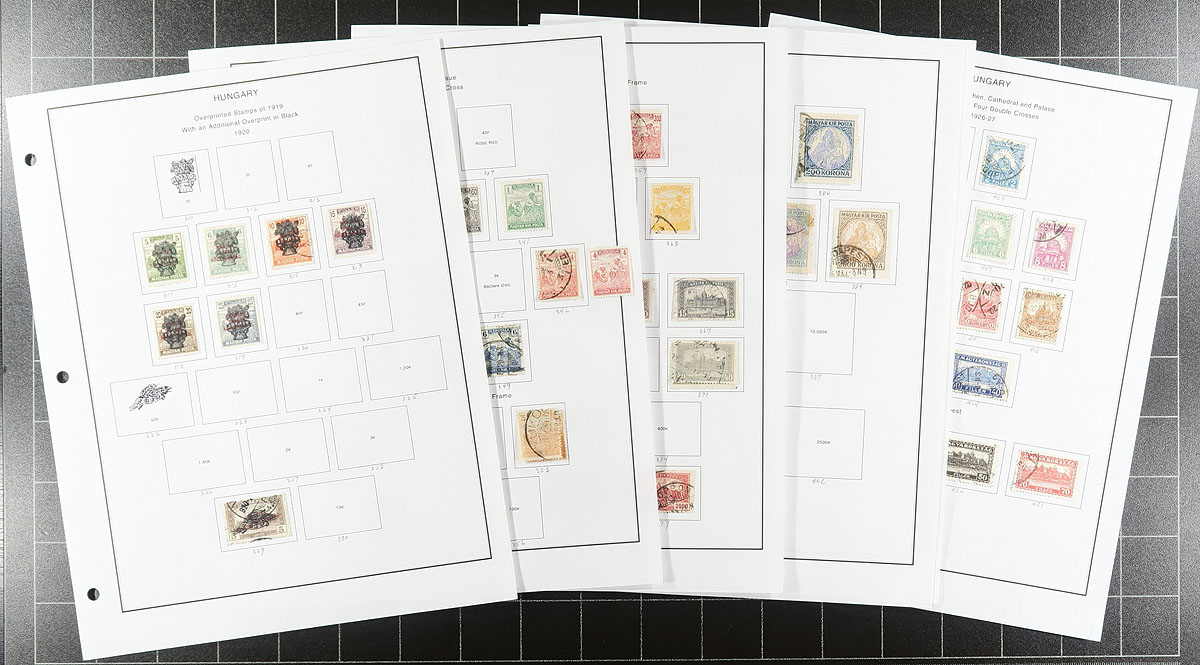 Large accumulation of mint and used Hungary, 1870's-2000's, containing several thousands of stamps in over 100 stock or album pages, and a few stockbooks. A cursory check indicated material ranging from Scott #4/3200, including singles, sets, souvenir sheets, back of the book issues, and a stockbook of used occupation stamps. We note some material cataloguing $5 to $10 each, with the owner's 2012 Scott catalogue value for the majority of material totaling $830.00, leaving better finds for the dedicated collector. A good lot for the worldwide collector, overall fine to very fine. Estimate =