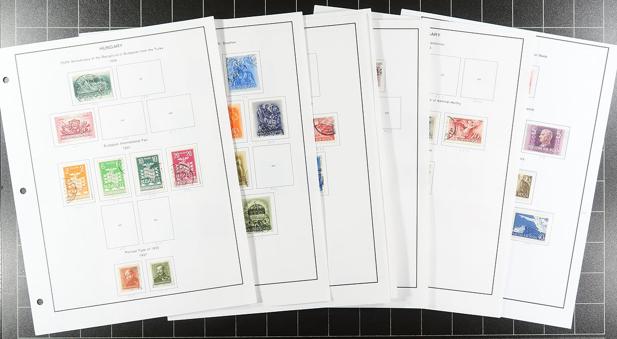 Large accumulation of mint and used Hungary, 1870's-2000's, containing several thousands of stamps in over 100 stock or album pages, and a few stockbooks. A cursory check indicated material ranging from Scott #4/3200, including singles, sets, souvenir sheets, back of the book issues, and a stockbook of used occupation stamps. We note some material cataloguing $5 to $10 each, with the owner's 2012 Scott catalogue value for the majority of material totaling $830.00, leaving better finds for the dedicated collector. A good lot for the worldwide collector, overall fine to very fine. Estimate =