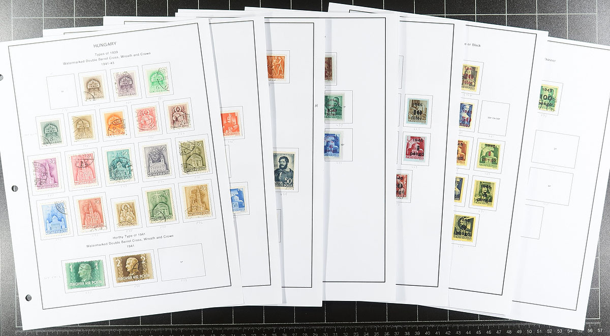 Large accumulation of mint and used Hungary, 1870's-2000's, containing several thousands of stamps in over 100 stock or album pages, and a few stockbooks. A cursory check indicated material ranging from Scott #4/3200, including singles, sets, souvenir sheets, back of the book issues, and a stockbook of used occupation stamps. We note some material cataloguing $5 to $10 each, with the owner's 2012 Scott catalogue value for the majority of material totaling $830.00, leaving better finds for the dedicated collector. A good lot for the worldwide collector, overall fine to very fine. Estimate =