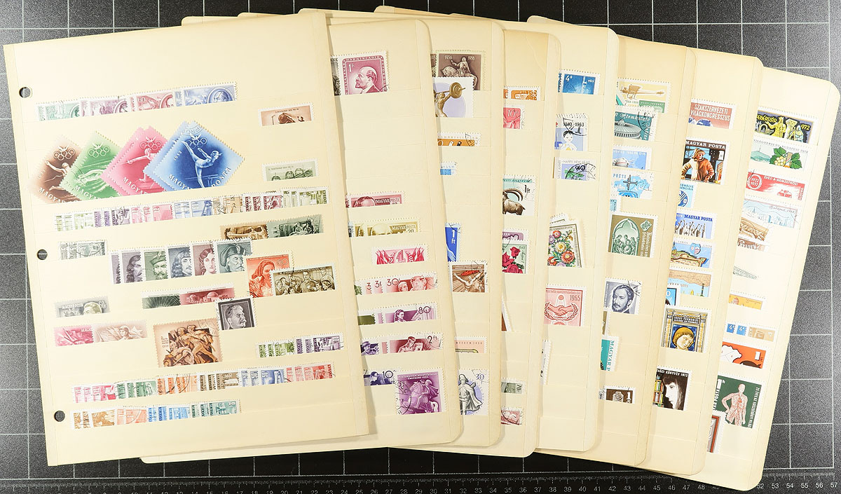 Large accumulation of mint and used Hungary, 1870's-2000's, containing several thousands of stamps in over 100 stock or album pages, and a few stockbooks. A cursory check indicated material ranging from Scott #4/3200, including singles, sets, souvenir sheets, back of the book issues, and a stockbook of used occupation stamps. We note some material cataloguing $5 to $10 each, with the owner's 2012 Scott catalogue value for the majority of material totaling $830.00, leaving better finds for the dedicated collector. A good lot for the worldwide collector, overall fine to very fine. Estimate =