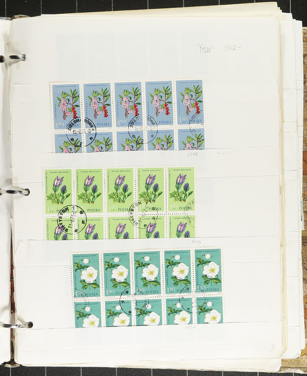 Large accumulation of mint and used Poland, 1918-1995, containing a few thousand stamps on several album pages and in 3 stockbooks. The lot generally ranges from Scott #11/3237, containing singles, several sets, and souvenir sheets, along with some back of the book issues, and some interesting "GROSZY" overprints. The strength of the lot appears to be in the 3 stockbooks, containing year sets from 1982-1984, along with several mint and used issues organized by topic, including air transportation, space, ships, nature, religion, and much more. Unchecked for catalogue values leaving finds for the dedicated collector, overall fine to very fine. Estimate =