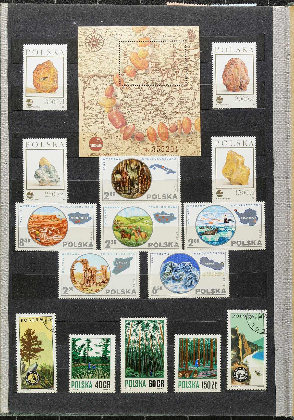Large accumulation of mint and used Poland, 1918-1995, containing a few thousand stamps on several album pages and in 3 stockbooks. The lot generally ranges from Scott #11/3237, containing singles, several sets, and souvenir sheets, along with some back of the book issues, and some interesting "GROSZY" overprints. The strength of the lot appears to be in the 3 stockbooks, containing year sets from 1982-1984, along with several mint and used issues organized by topic, including air transportation, space, ships, nature, religion, and much more. Unchecked for catalogue values leaving finds for the dedicated collector, overall fine to very fine. Estimate =