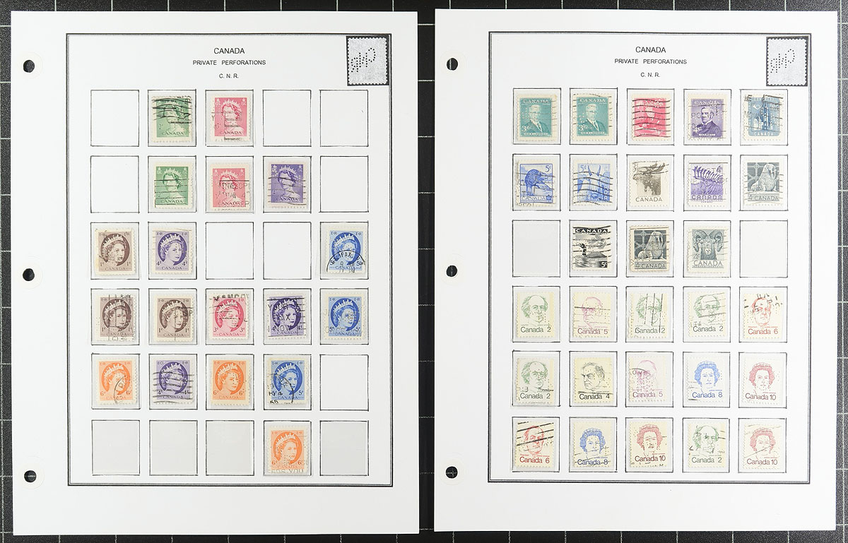 Nice collection / accumulation of Canada private perfins, 1910's-', containing over 1,000 stamps in stock pages and many well described computerized album pages. This lovely lot generally ranges from the Admirals to the 1980's, noting better representation from companies C.P.R., C.N.R., P.S., and B.T., along with roughly a third of the lot from other companies. Completely unchecked for positions or varieties, and ideal for the perfin specialist. Overall fine to very fine. All pages photographed online. Estimate =