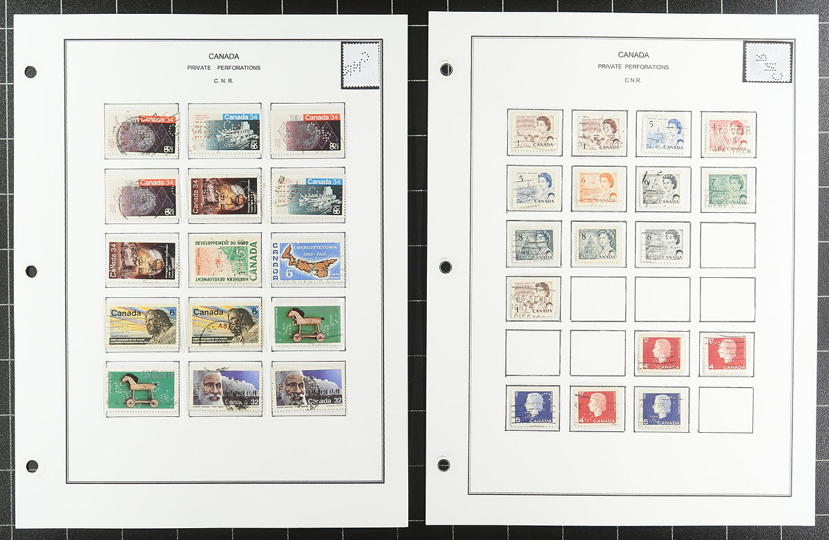 Nice collection / accumulation of Canada private perfins, 1910's-', containing over 1,000 stamps in stock pages and many well described computerized album pages. This lovely lot generally ranges from the Admirals to the 1980's, noting better representation from companies C.P.R., C.N.R., P.S., and B.T., along with roughly a third of the lot from other companies. Completely unchecked for positions or varieties, and ideal for the perfin specialist. Overall fine to very fine. All pages photographed online. Estimate =