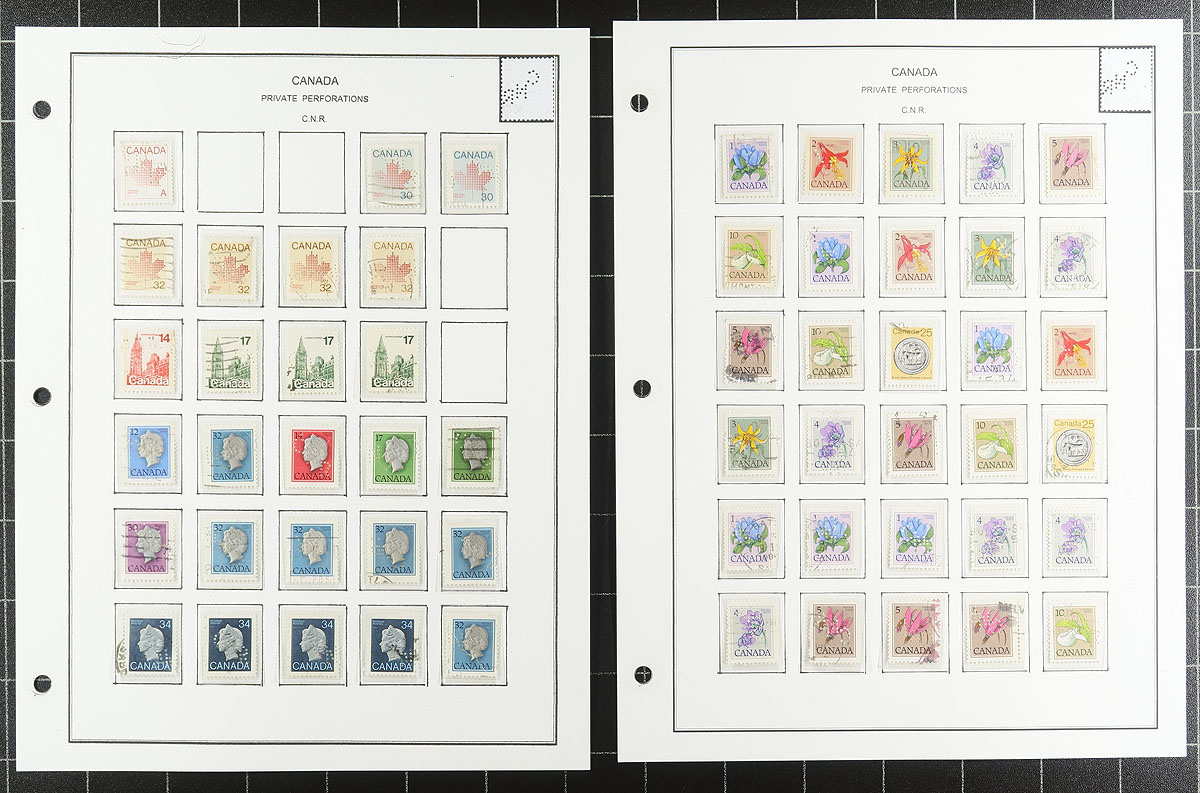 Nice collection / accumulation of Canada private perfins, 1910's-', containing over 1,000 stamps in stock pages and many well described computerized album pages. This lovely lot generally ranges from the Admirals to the 1980's, noting better representation from companies C.P.R., C.N.R., P.S., and B.T., along with roughly a third of the lot from other companies. Completely unchecked for positions or varieties, and ideal for the perfin specialist. Overall fine to very fine. All pages photographed online. Estimate =