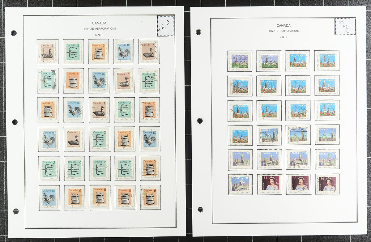 Nice collection / accumulation of Canada private perfins, 1910's-', containing over 1,000 stamps in stock pages and many well described computerized album pages. This lovely lot generally ranges from the Admirals to the 1980's, noting better representation from companies C.P.R., C.N.R., P.S., and B.T., along with roughly a third of the lot from other companies. Completely unchecked for positions or varieties, and ideal for the perfin specialist. Overall fine to very fine. All pages photographed online. Estimate =