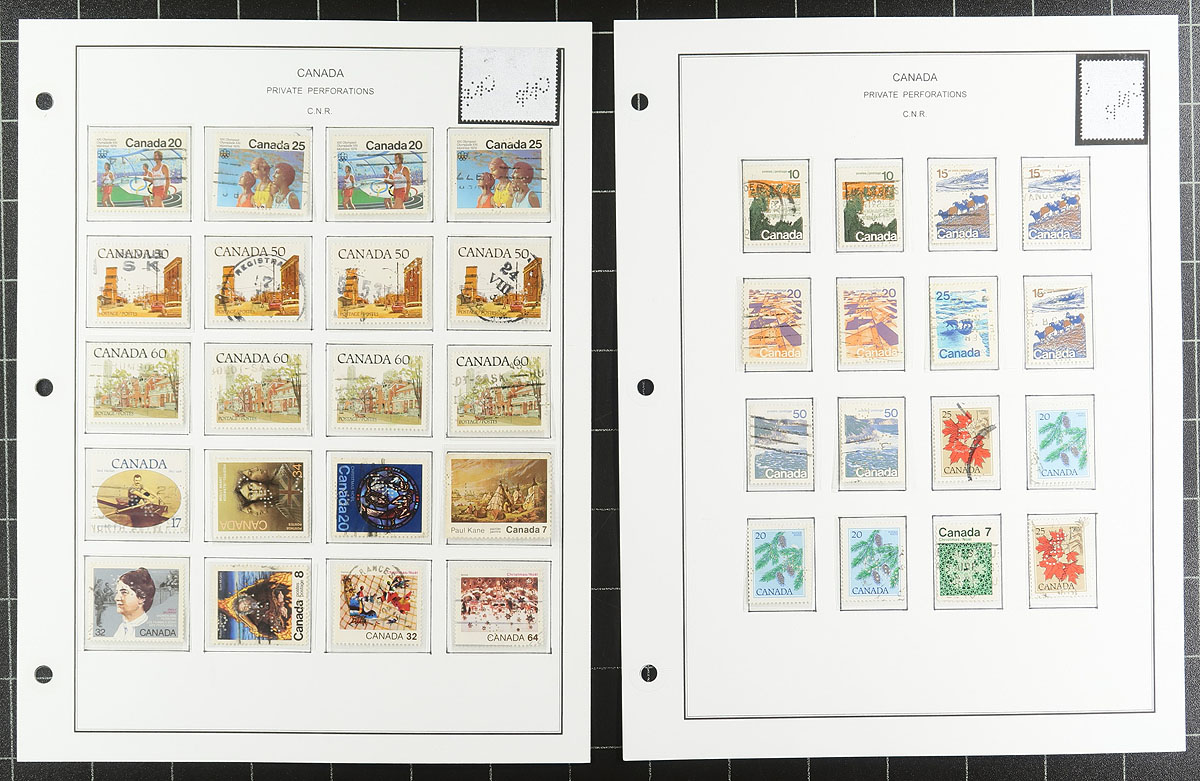 Nice collection / accumulation of Canada private perfins, 1910's-', containing over 1,000 stamps in stock pages and many well described computerized album pages. This lovely lot generally ranges from the Admirals to the 1980's, noting better representation from companies C.P.R., C.N.R., P.S., and B.T., along with roughly a third of the lot from other companies. Completely unchecked for positions or varieties, and ideal for the perfin specialist. Overall fine to very fine. All pages photographed online. Estimate =