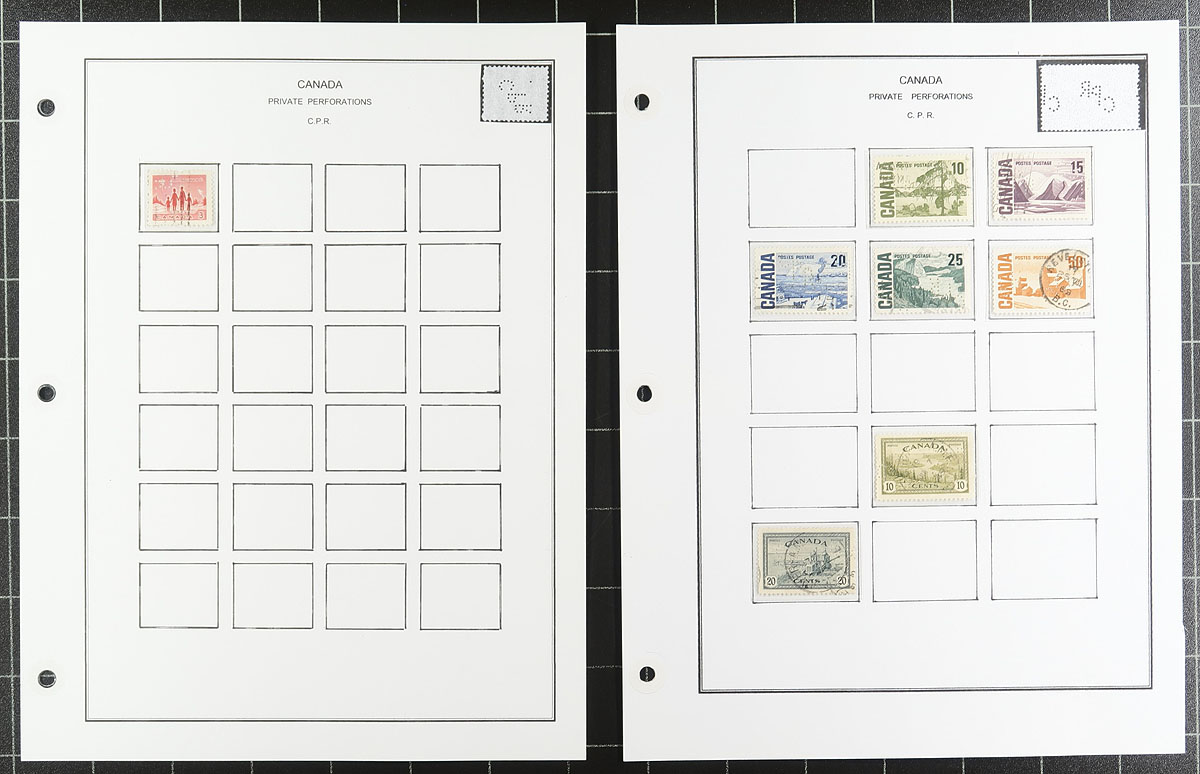 Nice collection / accumulation of Canada private perfins, 1910's-', containing over 1,000 stamps in stock pages and many well described computerized album pages. This lovely lot generally ranges from the Admirals to the 1980's, noting better representation from companies C.P.R., C.N.R., P.S., and B.T., along with roughly a third of the lot from other companies. Completely unchecked for positions or varieties, and ideal for the perfin specialist. Overall fine to very fine. All pages photographed online. Estimate =