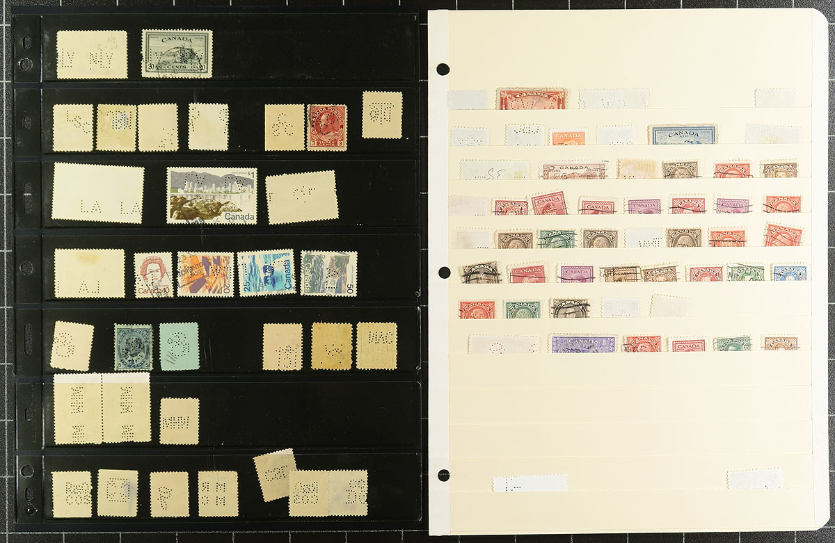 Nice collection / accumulation of Canada private perfins, 1910's-', containing over 1,000 stamps in stock pages and many well described computerized album pages. This lovely lot generally ranges from the Admirals to the 1980's, noting better representation from companies C.P.R., C.N.R., P.S., and B.T., along with roughly a third of the lot from other companies. Completely unchecked for positions or varieties, and ideal for the perfin specialist. Overall fine to very fine. All pages photographed online. Estimate =