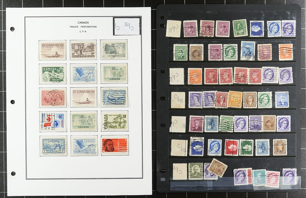 Nice collection / accumulation of Canada private perfins, 1910's-', containing over 1,000 stamps in stock pages and many well described computerized album pages. This lovely lot generally ranges from the Admirals to the 1980's, noting better representation from companies C.P.R., C.N.R., P.S., and B.T., along with roughly a third of the lot from other companies. Completely unchecked for positions or varieties, and ideal for the perfin specialist. Overall fine to very fine. All pages photographed online. Estimate =