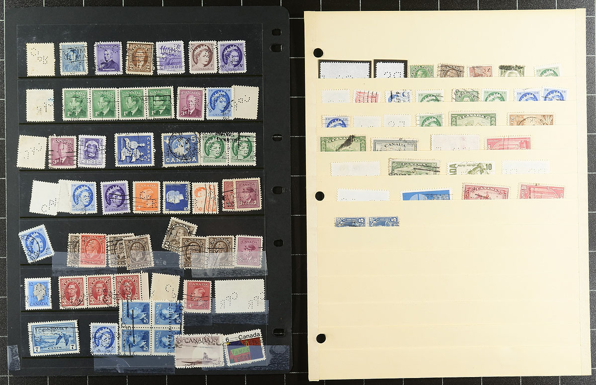 Nice collection / accumulation of Canada private perfins, 1910's-', containing over 1,000 stamps in stock pages and many well described computerized album pages. This lovely lot generally ranges from the Admirals to the 1980's, noting better representation from companies C.P.R., C.N.R., P.S., and B.T., along with roughly a third of the lot from other companies. Completely unchecked for positions or varieties, and ideal for the perfin specialist. Overall fine to very fine. All pages photographed online. Estimate =