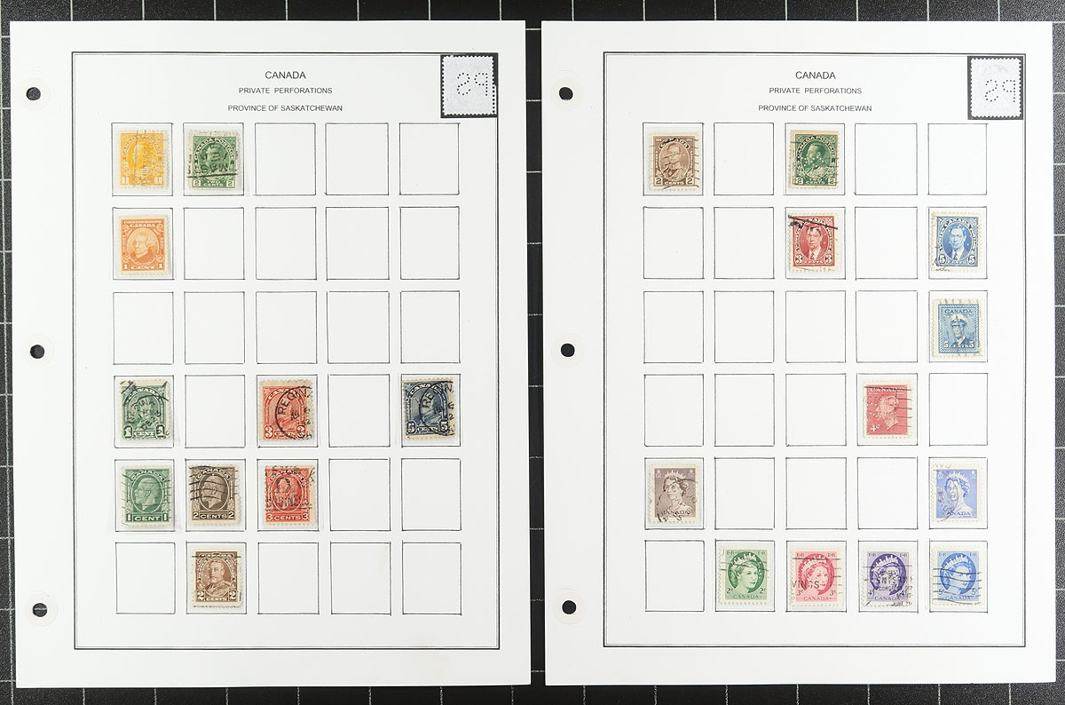 Nice collection / accumulation of Canada private perfins, 1910's-', containing over 1,000 stamps in stock pages and many well described computerized album pages. This lovely lot generally ranges from the Admirals to the 1980's, noting better representation from companies C.P.R., C.N.R., P.S., and B.T., along with roughly a third of the lot from other companies. Completely unchecked for positions or varieties, and ideal for the perfin specialist. Overall fine to very fine. All pages photographed online. Estimate =