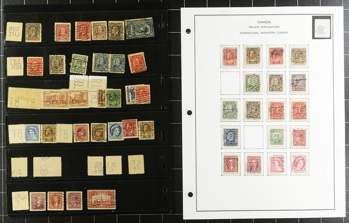 Nice collection / accumulation of Canada private perfins, 1910's-', containing over 1,000 stamps in stock pages and many well described computerized album pages. This lovely lot generally ranges from the Admirals to the 1980's, noting better representation from companies C.P.R., C.N.R., P.S., and B.T., along with roughly a third of the lot from other companies. Completely unchecked for positions or varieties, and ideal for the perfin specialist. Overall fine to very fine. All pages photographed online. Estimate =