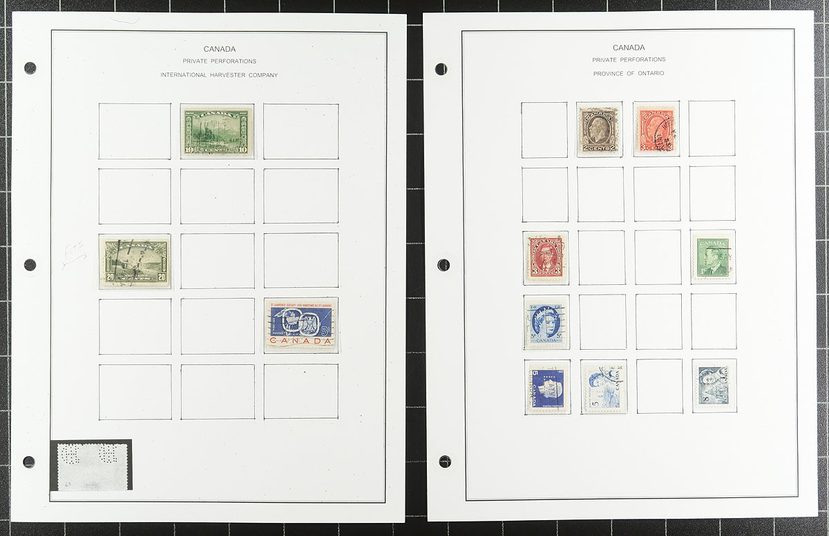 Nice collection / accumulation of Canada private perfins, 1910's-', containing over 1,000 stamps in stock pages and many well described computerized album pages. This lovely lot generally ranges from the Admirals to the 1980's, noting better representation from companies C.P.R., C.N.R., P.S., and B.T., along with roughly a third of the lot from other companies. Completely unchecked for positions or varieties, and ideal for the perfin specialist. Overall fine to very fine. All pages photographed online. Estimate =