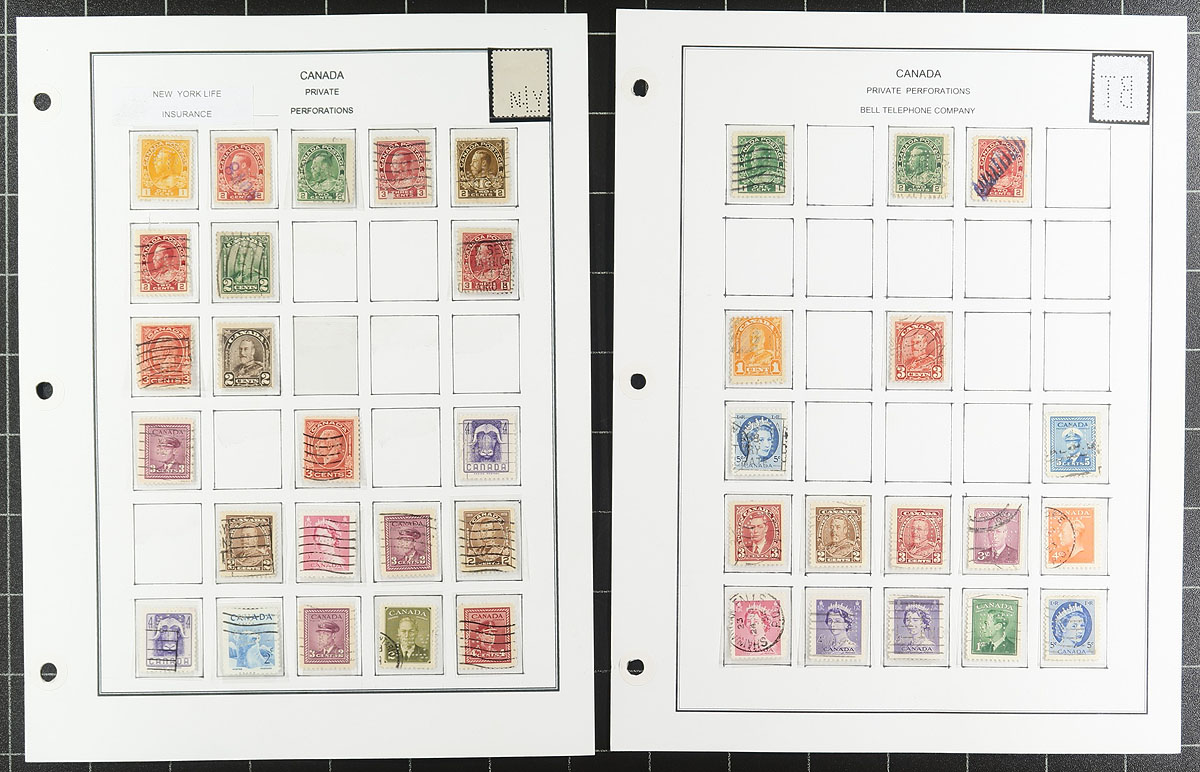 Nice collection / accumulation of Canada private perfins, 1910's-', containing over 1,000 stamps in stock pages and many well described computerized album pages. This lovely lot generally ranges from the Admirals to the 1980's, noting better representation from companies C.P.R., C.N.R., P.S., and B.T., along with roughly a third of the lot from other companies. Completely unchecked for positions or varieties, and ideal for the perfin specialist. Overall fine to very fine. All pages photographed online. Estimate =