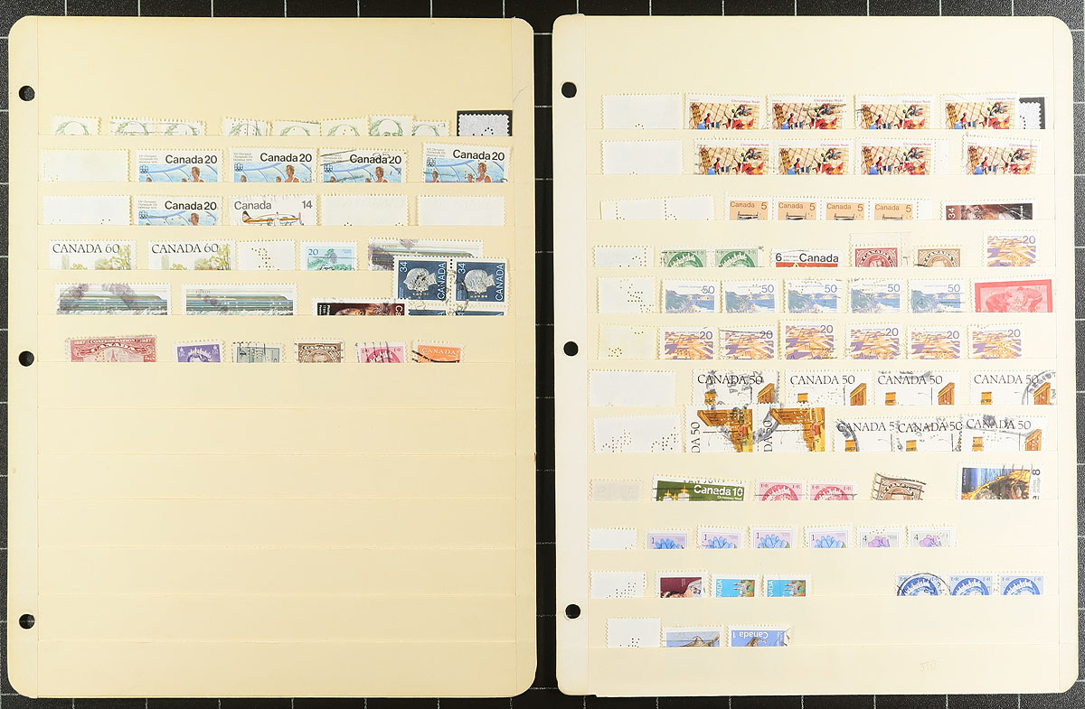 Nice collection / accumulation of Canada private perfins, 1910's-', containing over 1,000 stamps in stock pages and many well described computerized album pages. This lovely lot generally ranges from the Admirals to the 1980's, noting better representation from companies C.P.R., C.N.R., P.S., and B.T., along with roughly a third of the lot from other companies. Completely unchecked for positions or varieties, and ideal for the perfin specialist. Overall fine to very fine. All pages photographed online. Estimate =