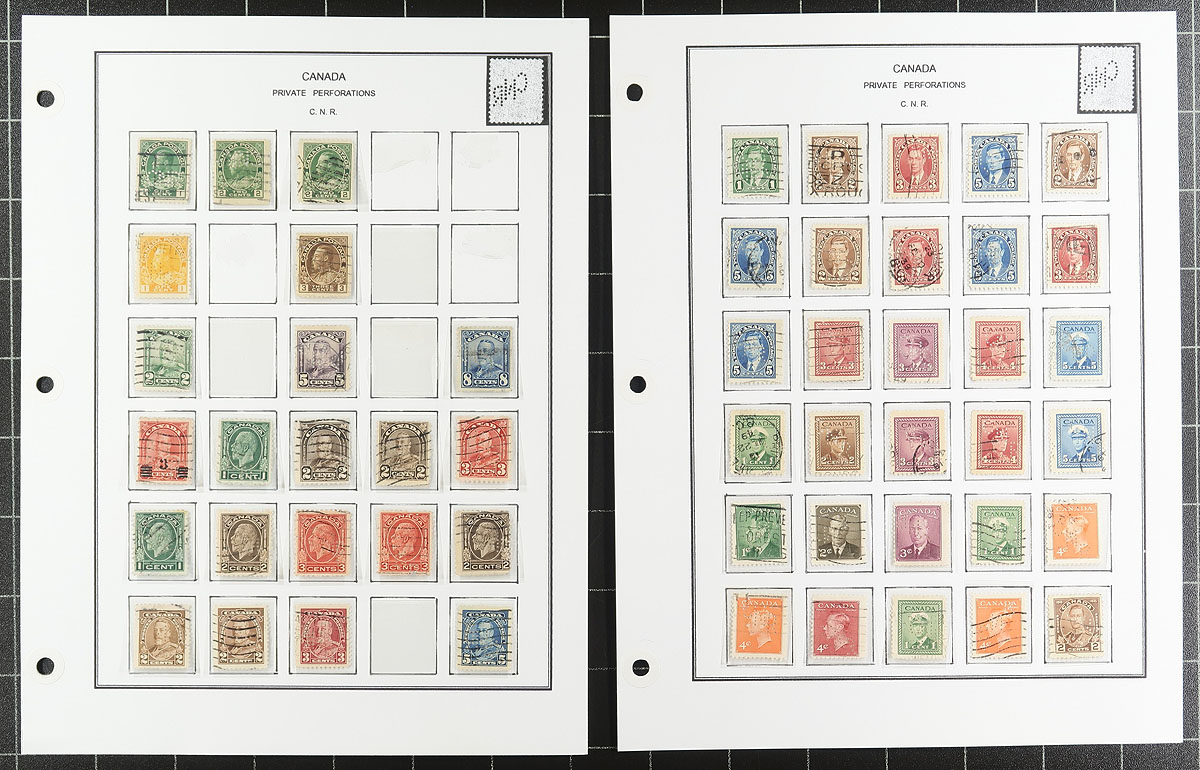 Nice collection / accumulation of Canada private perfins, 1910's-', containing over 1,000 stamps in stock pages and many well described computerized album pages. This lovely lot generally ranges from the Admirals to the 1980's, noting better representation from companies C.P.R., C.N.R., P.S., and B.T., along with roughly a third of the lot from other companies. Completely unchecked for positions or varieties, and ideal for the perfin specialist. Overall fine to very fine. All pages photographed online. Estimate =