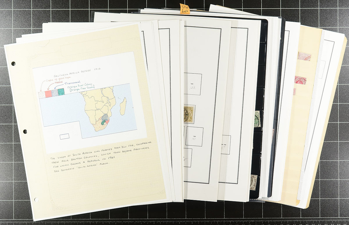 Collections of primarily used South Africa Colonies, 1860's-1903, containing a few hundred stamps, many on well organized computerized album pages and a few stock pages. The collection contains representation from Cape of Good Hope, Transvaal, Natal, and Orange River Colony, noting a few highlights described by the owner with #s Cape of Good Hope 12-13 (used, $460 total), 16 (used, $42.50), along with some stamps cataloging $5 to $15 each. Owner's 2026 catalogue value for the lot totals US$962.85. A nice lot for the Commonwealth collector as we did not check for better varieties or postmarks, overall fine to very fine. All pages photographed online. Estimate =