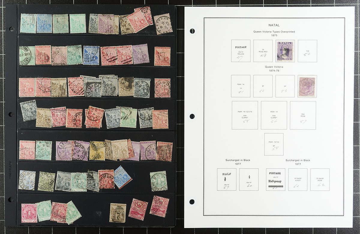 Collections of primarily used South Africa Colonies, 1860's-1903, containing a few hundred stamps, many on well organized computerized album pages and a few stock pages. The collection contains representation from Cape of Good Hope, Transvaal, Natal, and Orange River Colony, noting a few highlights described by the owner with #s Cape of Good Hope 12-13 (used, $460 total), 16 (used, $42.50), along with some stamps cataloging $5 to $15 each. Owner's 2026 catalogue value for the lot totals US$962.85. A nice lot for the Commonwealth collector as we did not check for better varieties or postmarks, overall fine to very fine. All pages photographed online. Estimate =