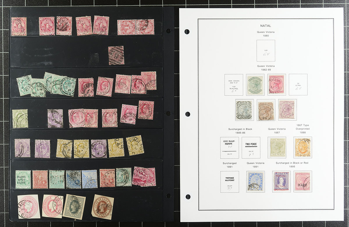 Collections of primarily used South Africa Colonies, 1860's-1903, containing a few hundred stamps, many on well organized computerized album pages and a few stock pages. The collection contains representation from Cape of Good Hope, Transvaal, Natal, and Orange River Colony, noting a few highlights described by the owner with #s Cape of Good Hope 12-13 (used, $460 total), 16 (used, $42.50), along with some stamps cataloging $5 to $15 each. Owner's 2026 catalogue value for the lot totals US$962.85. A nice lot for the Commonwealth collector as we did not check for better varieties or postmarks, overall fine to very fine. All pages photographed online. Estimate =