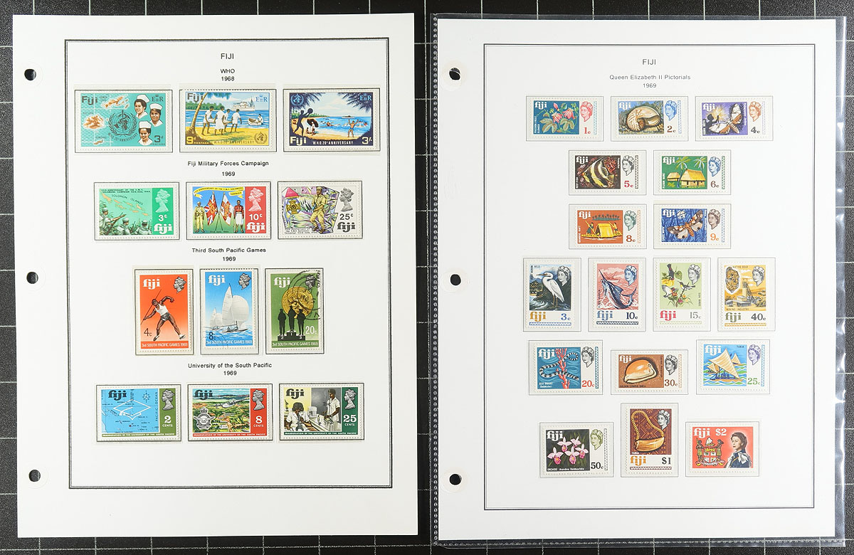 Nice collection of mint and used Fiji, 1878-1995, containing many hundreds of stamps, man on well organized computerized album pages and a few stock pages. This neatly organized collection ranges from Scott #40/739A, containing singles and several sets, along with a few souvenir sheets. Just a few better items include with #s 89-90 (used, $80 total), 117/131A (mix of mint and used, c.v. $88.60), along with some sets cataloguing $10 and up, including 1935 Silver Jubilee and 1948 Silver Wedding, and more. Owner's 2019 Scott catalogue value for the collection totals $871.05. A nice collection that should be continued, overall fine to very fine. All pages photographed online. Estimate =