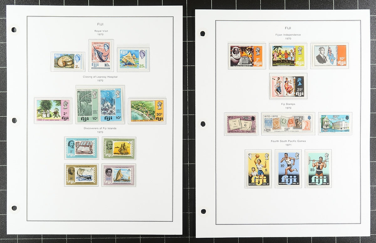 Nice collection of mint and used Fiji, 1878-1995, containing many hundreds of stamps, man on well organized computerized album pages and a few stock pages. This neatly organized collection ranges from Scott #40/739A, containing singles and several sets, along with a few souvenir sheets. Just a few better items include with #s 89-90 (used, $80 total), 117/131A (mix of mint and used, c.v. $88.60), along with some sets cataloguing $10 and up, including 1935 Silver Jubilee and 1948 Silver Wedding, and more. Owner's 2019 Scott catalogue value for the collection totals $871.05. A nice collection that should be continued, overall fine to very fine. All pages photographed online. Estimate =