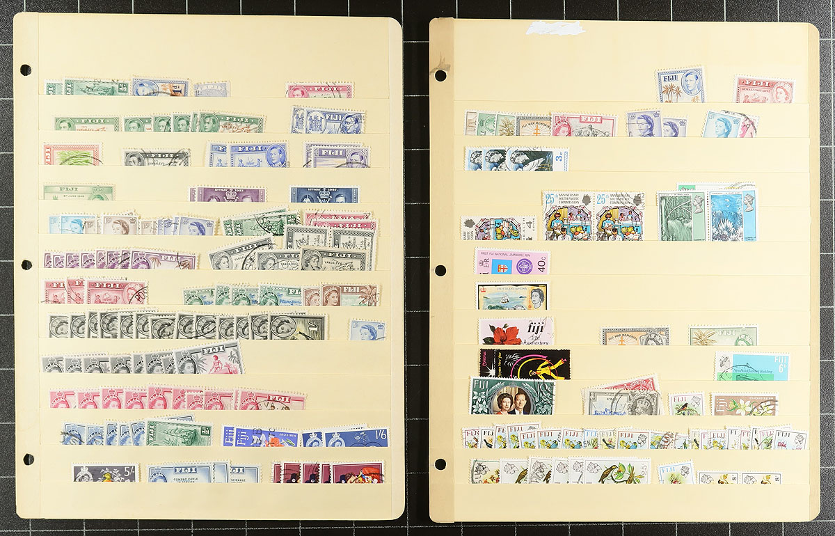 Nice collection of mint and used Fiji, 1878-1995, containing many hundreds of stamps, man on well organized computerized album pages and a few stock pages. This neatly organized collection ranges from Scott #40/739A, containing singles and several sets, along with a few souvenir sheets. Just a few better items include with #s 89-90 (used, $80 total), 117/131A (mix of mint and used, c.v. $88.60), along with some sets cataloguing $10 and up, including 1935 Silver Jubilee and 1948 Silver Wedding, and more. Owner's 2019 Scott catalogue value for the collection totals $871.05. A nice collection that should be continued, overall fine to very fine. All pages photographed online. Estimate =