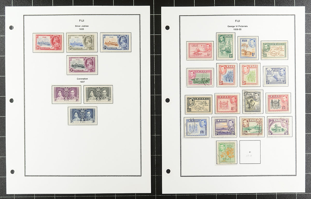 Nice collection of mint and used Fiji, 1878-1995, containing many hundreds of stamps, man on well organized computerized album pages and a few stock pages. This neatly organized collection ranges from Scott #40/739A, containing singles and several sets, along with a few souvenir sheets. Just a few better items include with #s 89-90 (used, $80 total), 117/131A (mix of mint and used, c.v. $88.60), along with some sets cataloguing $10 and up, including 1935 Silver Jubilee and 1948 Silver Wedding, and more. Owner's 2019 Scott catalogue value for the collection totals $871.05. A nice collection that should be continued, overall fine to very fine. All pages photographed online. Estimate =