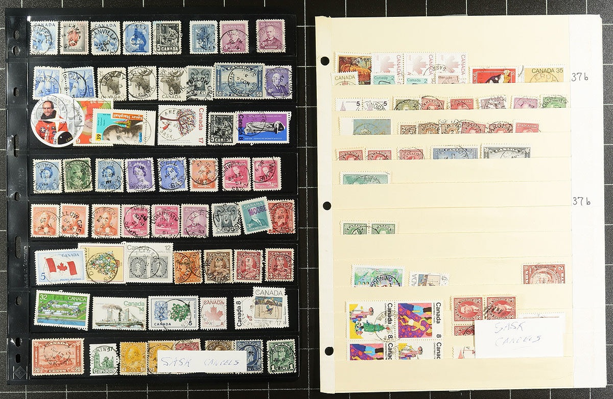 Nice collection of used Canada collected for 'sock on the nose' town cancels, Small Queens up to the 1980's. The lot contains just over 1,000 stamps in over 20 well organized pages, noting hundreds of different towns with representation from across the country with better from British Columbia, Alberta, Saskatchewan, and Ontario. Just a few of the postmarks encountered include cds, split ring, squared circle, orb, and a few others. A lovely well organized lot for the Canada postmark collector, overall fine to very fine. All pages photographed online. Estimate =