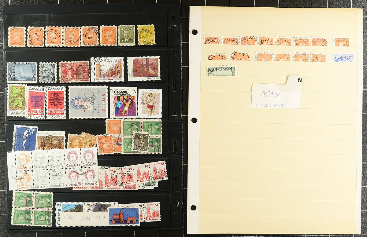 Nice collection of used Canada collected for 'sock on the nose' town cancels, Small Queens up to the 1980's. The lot contains just over 1,000 stamps in over 20 well organized pages, noting hundreds of different towns with representation from across the country with better from British Columbia, Alberta, Saskatchewan, and Ontario. Just a few of the postmarks encountered include cds, split ring, squared circle, orb, and a few others. A lovely well organized lot for the Canada postmark collector, overall fine to very fine. All pages photographed online. Estimate =