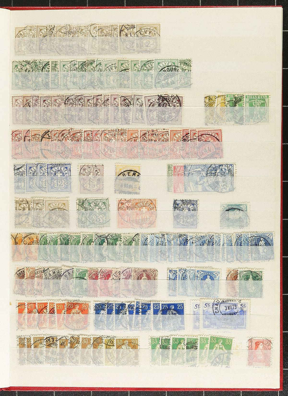 Stock of used Switzerland, 1882-2016, containing a few thousand stamps in a well filled 16 page stockbook. The lot generally ranges from Scott #69/1609, along with semi-postal issues, with heavy duplication for some issues. A cursory check did indicate several classic issues, along with a few better cataloguing items noting Scott #98-100 (c.v. $53.50), with most stamps cataloguing around $1 each. A nice lot for the specialist as we did not check for better papers, postmarks, etc. Overall fine to very fine. Estimate =
