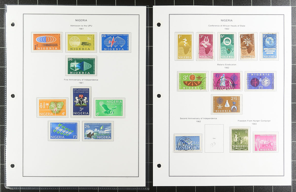 Nice collection of mint and used Nigeria, 1882-1971, containing a few hundred stamps in mostly well organized computerized album pages and a few stock pages. The lot generally ranges from Scott #1/264, along with selections of Lagos, Niger Coast Protectorate, and Northern and Southern Nigeria, which include singles, sets, and partial sets, with some cataloguing $10 to $20 and up, including mint Omnibus sets and more. Owner's 2019 Scott catalogue value for the collection totals US$566.95. A nice starter collection of this very interesting area of philately. Estimate =