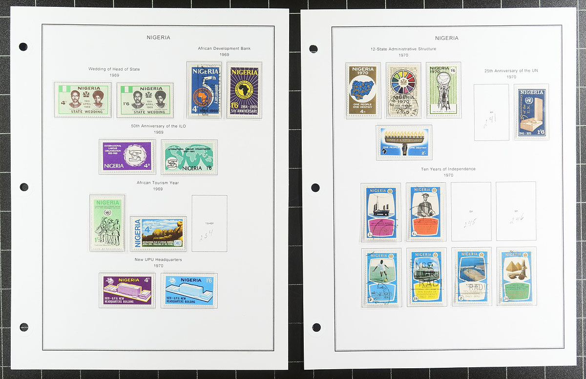 Nice collection of mint and used Nigeria, 1882-1971, containing a few hundred stamps in mostly well organized computerized album pages and a few stock pages. The lot generally ranges from Scott #1/264, along with selections of Lagos, Niger Coast Protectorate, and Northern and Southern Nigeria, which include singles, sets, and partial sets, with some cataloguing $10 to $20 and up, including mint Omnibus sets and more. Owner's 2019 Scott catalogue value for the collection totals US$566.95. A nice starter collection of this very interesting area of philately. Estimate =