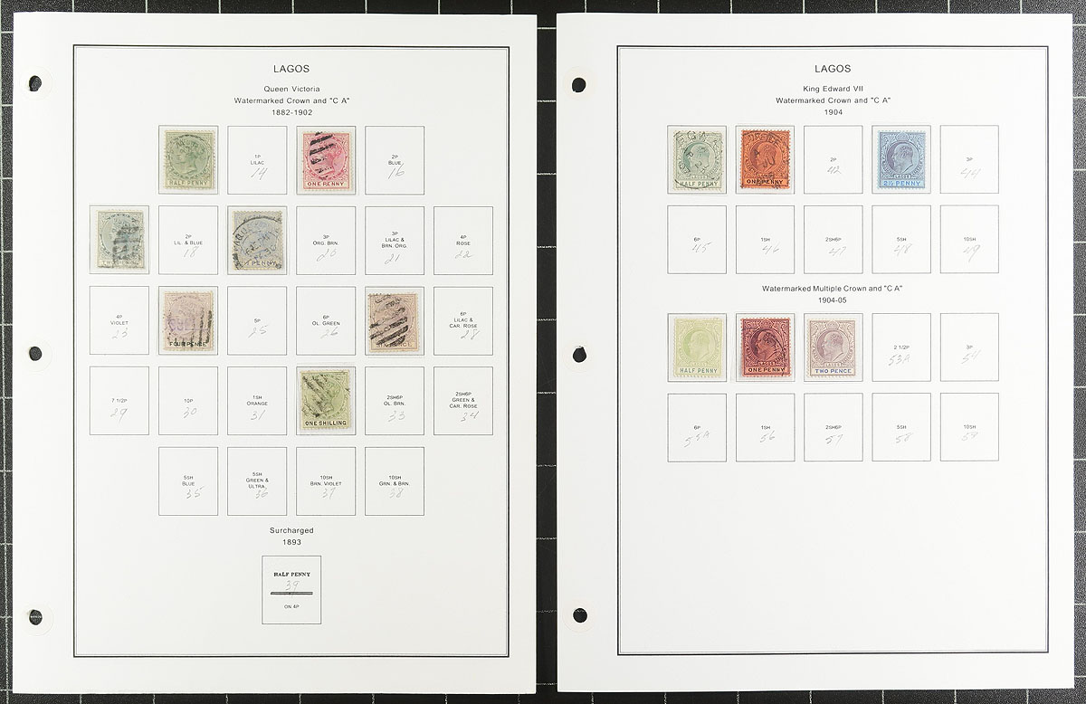 Nice collection of mint and used Nigeria, 1882-1971, containing a few hundred stamps in mostly well organized computerized album pages and a few stock pages. The lot generally ranges from Scott #1/264, along with selections of Lagos, Niger Coast Protectorate, and Northern and Southern Nigeria, which include singles, sets, and partial sets, with some cataloguing $10 to $20 and up, including mint Omnibus sets and more. Owner's 2019 Scott catalogue value for the collection totals US$566.95. A nice starter collection of this very interesting area of philately. Estimate =