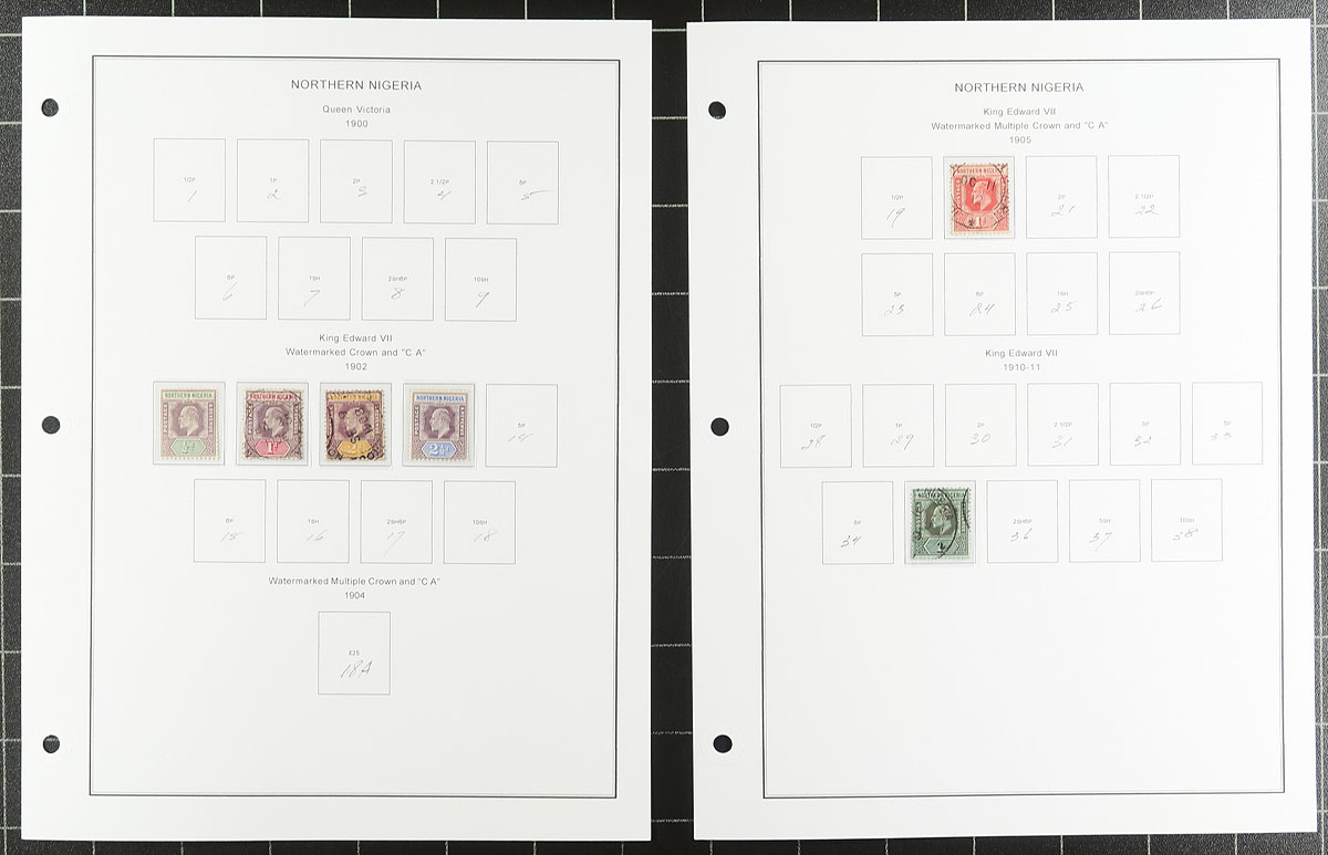 Nice collection of mint and used Nigeria, 1882-1971, containing a few hundred stamps in mostly well organized computerized album pages and a few stock pages. The lot generally ranges from Scott #1/264, along with selections of Lagos, Niger Coast Protectorate, and Northern and Southern Nigeria, which include singles, sets, and partial sets, with some cataloguing $10 to $20 and up, including mint Omnibus sets and more. Owner's 2019 Scott catalogue value for the collection totals US$566.95. A nice starter collection of this very interesting area of philately. Estimate =